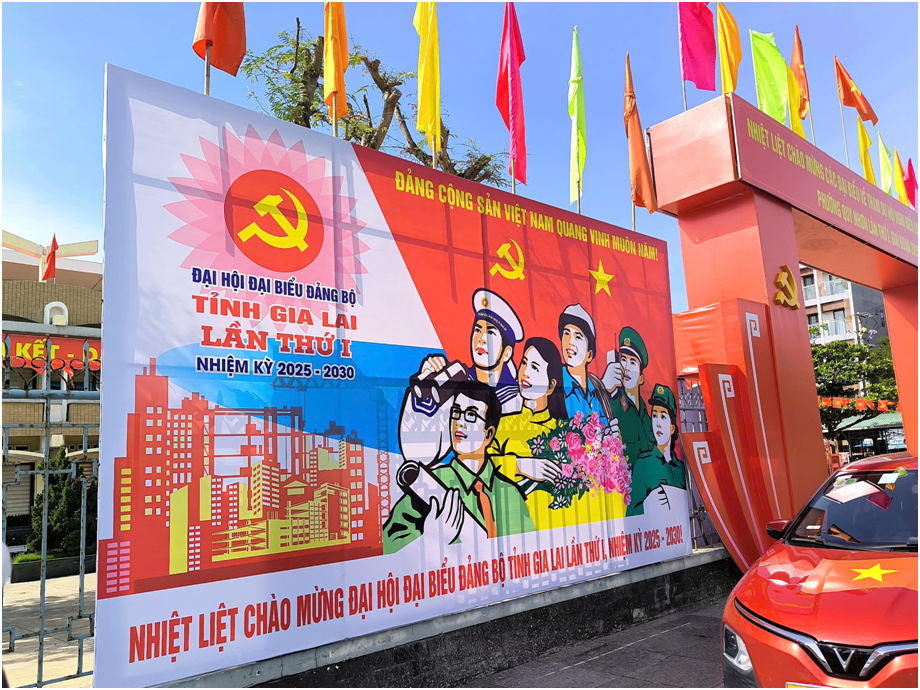 Một cụm pa-nô tuyên truyền trực quan với thông điệp và hình ảnh ý nghĩa tại Phường Quy Nhơn, chào mừng Đại hội đại biểu Đảng bộ tỉnh Gia Lai lần thứ I.